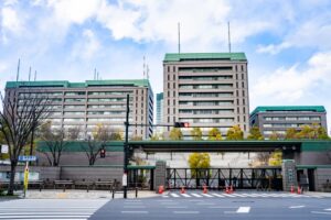 防衛省の入り口の門から見える内部はきれいで新しくて、